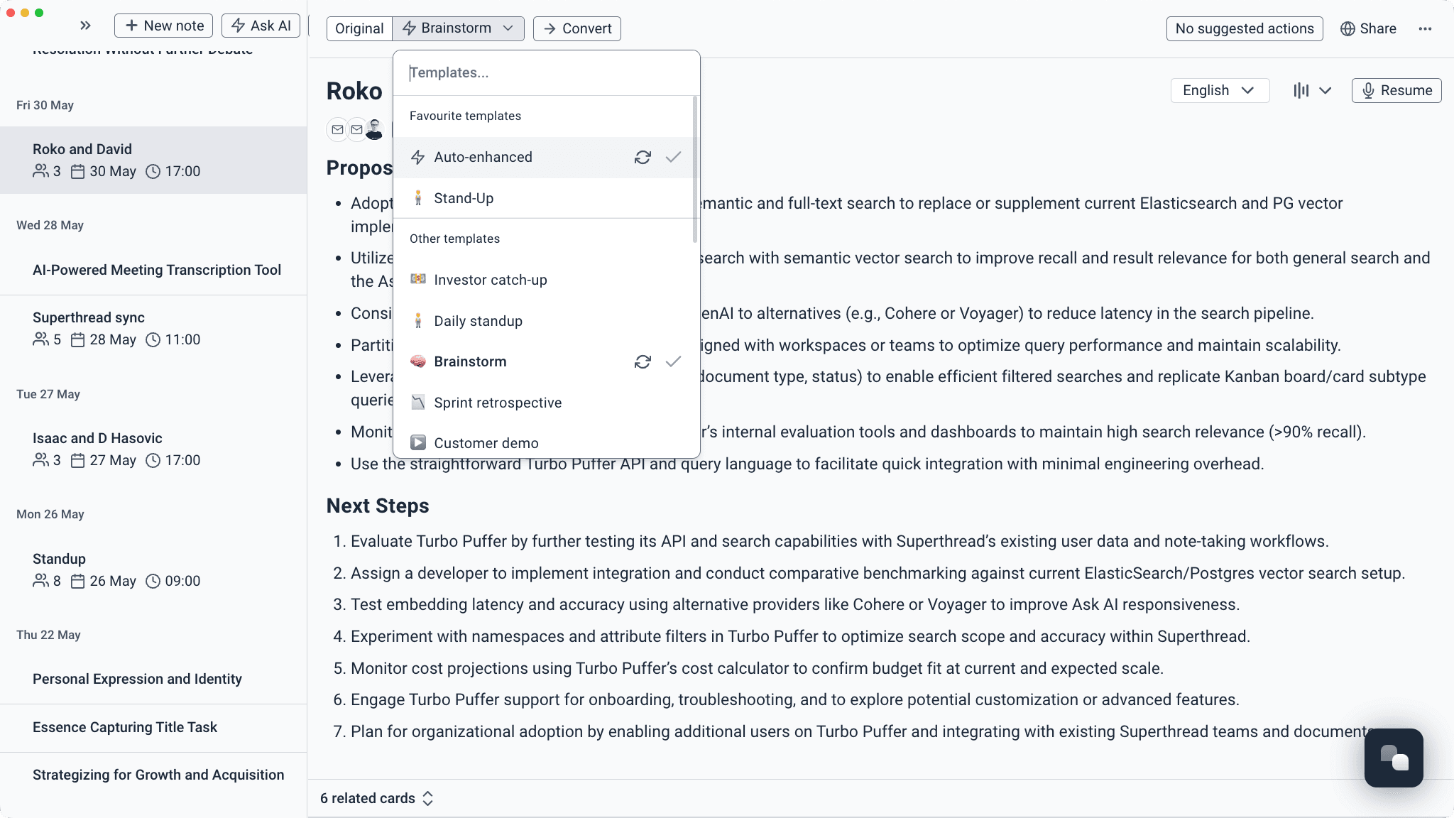 Superthread transcribes your meetings, compares the discussion to existing work, then suggests tasks, and highlights decisions – just review and get back to work.